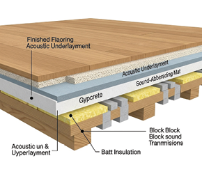 For floors, acoustic underlayment placed beneath finished flooring absorbs impact noise and reduces sound transmission between levels. In multi-story construction, a layer of gypcrete over a sound-absorbing mat on the subfloor effectively reduces both impact and airborne sound. Batt insulation between floor joists also helps absorb airborne sound.